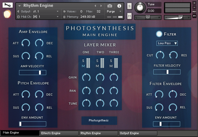 The Photosynthesis Engine is a free interface for Kontakt to make creating your own Kontakt instruments easy. Import samples, then manipulate them with sound shaping, filters, 13 effects, and a rhythm section featuring a step sequencer, filter sequencer, 2 filter LFOs, and gain/pan/pitch LFOs. Watch the engine walkthrough for a full feature overview, and take a look at the sound creation tutorial to learn how to start creating your own sounds.